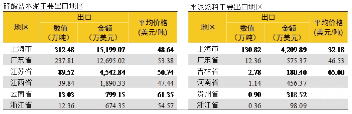 3、水泥出口地集中在上海、廣東和江蘇地區(qū)